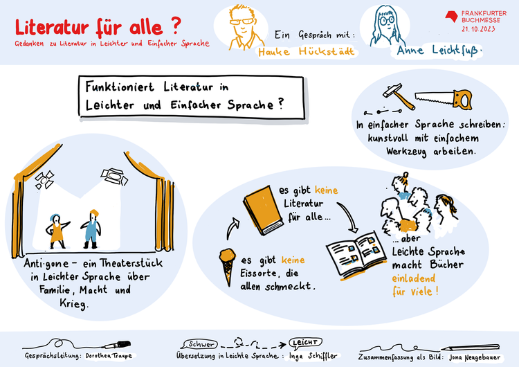 Was bei Literatur in Leichter und Einfacher Sprache alles wichtig ist, zeigt dieses Graphic Recording von Jona Neugebauer, entstanden bei der Frankfurter Buchmesse 2023. Hier kannst du alle Teile angucken.